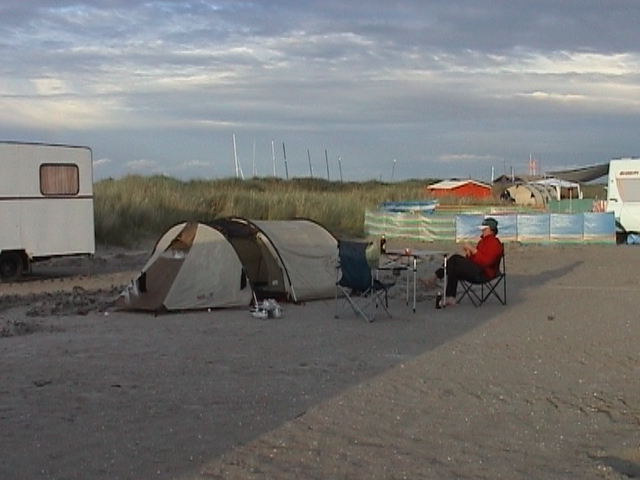 Hier stehen wenige Zelte, nur ein paar Wohnwagen. Wir bauen auf und haben Probleme, die Zeltnägel fest zu bekommen. Der Untergrund ist nämlich halbfester Sand. Aber es geht so leidlich. Als das Zelt steht, kommt ein Nachbar und fragt, ob wir einen Spaten haben. Nun, wie immer haben wir auch auf dieser Reise eine beachtliche Auswahl an Convenience-Produkten der Outdoor-Industrie dabei, aber einen Spaten??? Ob er sich den nicht woanders leihen kann. Nein nein, beteuert er, nicht wir sollen ihm, er will uns einen leihen! Wir sollen einen Graben um das Zelt ziehen, damit der Regen ablaufen kann. Gestern in der Nacht habe der ganze Platz zwischen den Dünen innerhalb von 10 Minuten etwa 20 cm unter Wasser gestanden und alle Camper hätten Gräben gezogen. So etwas wolle er uns ersparen. Na, das kann ja heiter werden. Wir nehmen also dankend den Spaten und graben einen Graben…