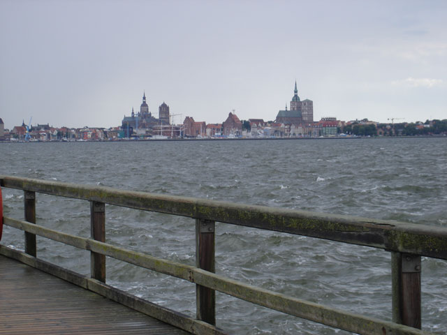 aber doch ordentlichen Eindruck, weshalb wir froh sind, ein sonniges Plätzchen auf der Zeltwiese ergattert zu haben. Nach dem Zeltaufbau gehen wir zum Fähranleger und essen etwas. Da es inzwischen wieder heftig regnet, sind wir froh, heute nicht mehr weitergefahren zu sein. Außerdem ist das Panorama vom Fähranleger auf das Altstadtensemble von Stralsund wirklich sehenswert - wie zu Hansezeiten!